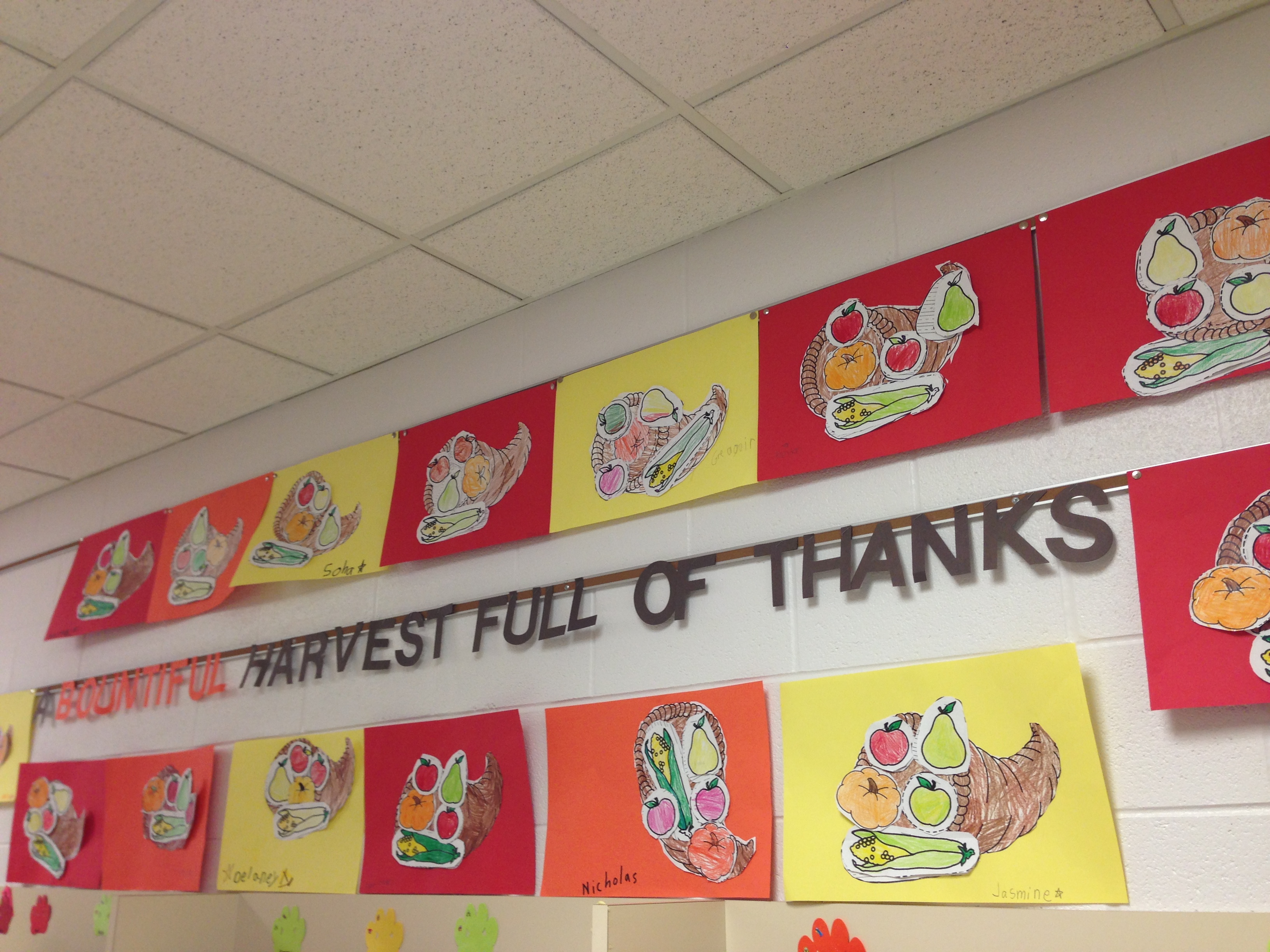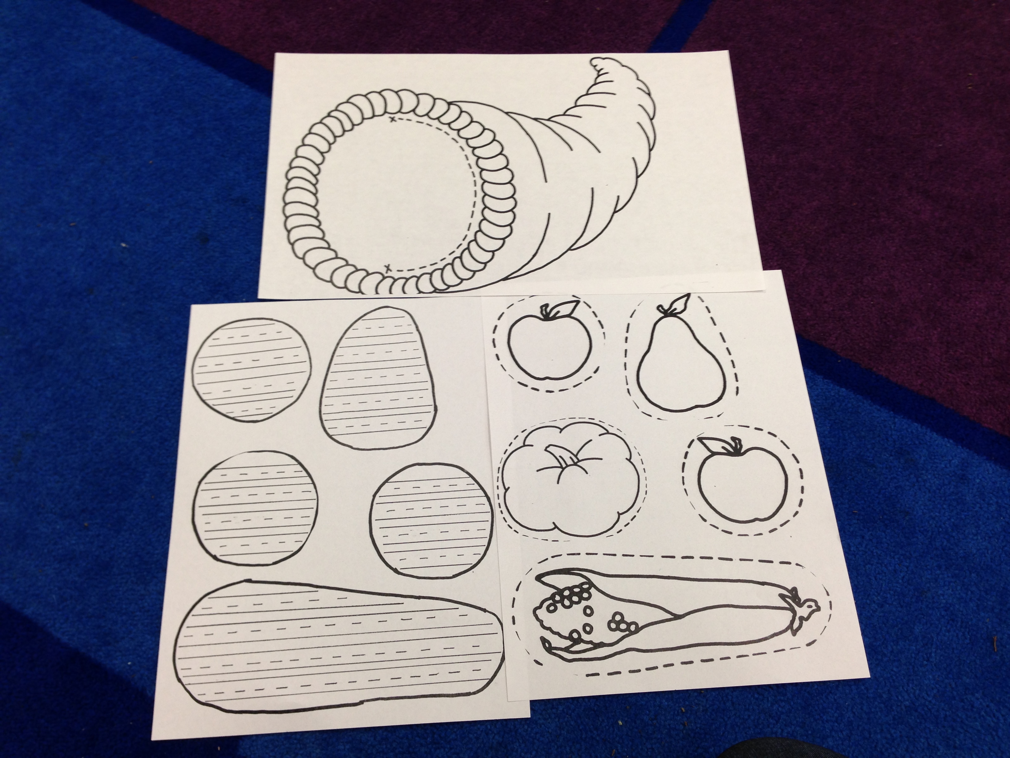 Last week at our first grade team meeting, we decided we wanted to do a writing activity for the students to write what they are thankful for. We wanted to do something different than the standard turkey and writing in his feathers. We thought of other Thanksgiving symbols and decided to use fruit in a cornucopia. The teachers looked through books and templates they had, and I was ready to search for ideas on the computer. It was a complete group effort to create and design this project.