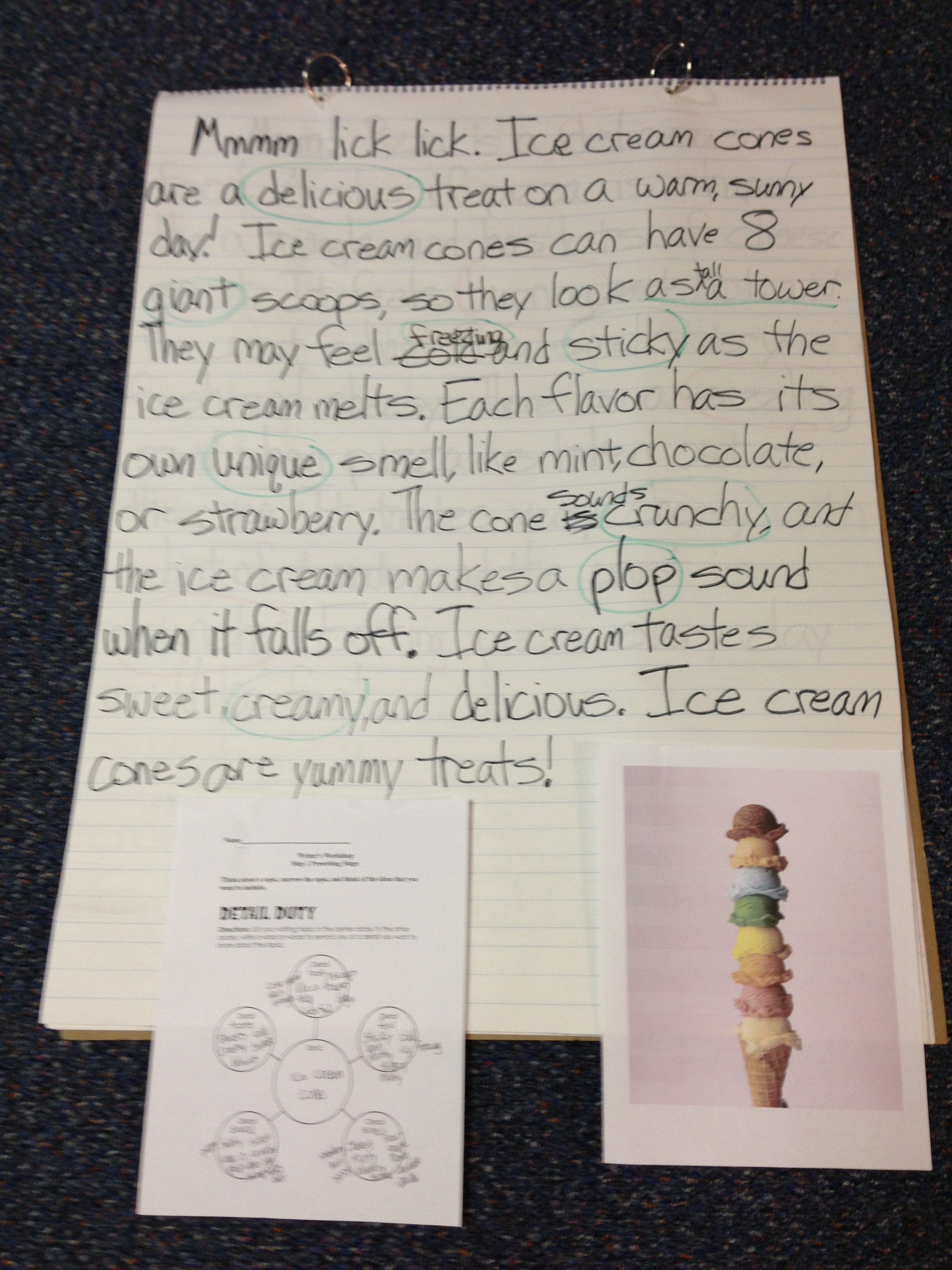 I also used the 6 Traits Writing Program to teach my students components of writing. To teach the Word Choice and Ideas traits, my students worked on describing food using the 5 senses. First, I modeled how to brainstorm and turn that into a paragraph. Next, students brainstormed in partners and we created a paragraph together. Finally, students were given the chance to brainstorm with a partner and write their own paragraph. The students were very creative and came up with some great descriptive words. Here are examples of student’s independent paragraphs describing a banana split at different writing levels-high, average, and low. |